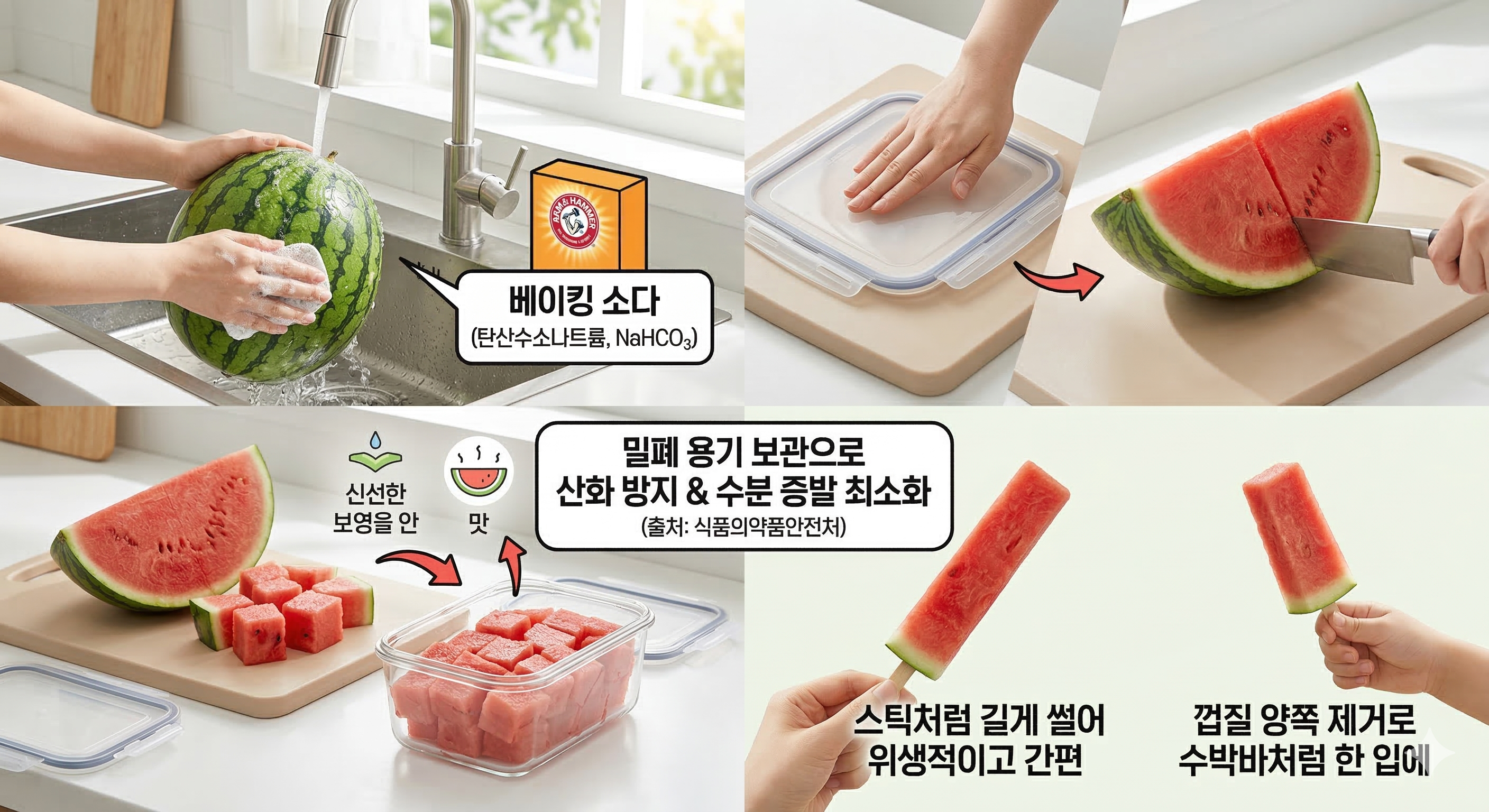 수박을 자를 때 가장 먼저 할 일은 껍질을 베이킹 소다로 문질러 흐르는 물에 헹구는 것입니다. 여기서 베이킹 소다란 탄산수소나트륨(NaHCO₃)을 의미하며, 약알칼리성 성질로 과일 표면의 농약 잔류물이나 이물질을 효과적으로 제거할 수 있는 천연 세정제입니다. 제가 직접 써보니 그냥 물로만 씻을 때보다 껍질 표면이 훨씬 깔끔하게 느껴졌습니다.